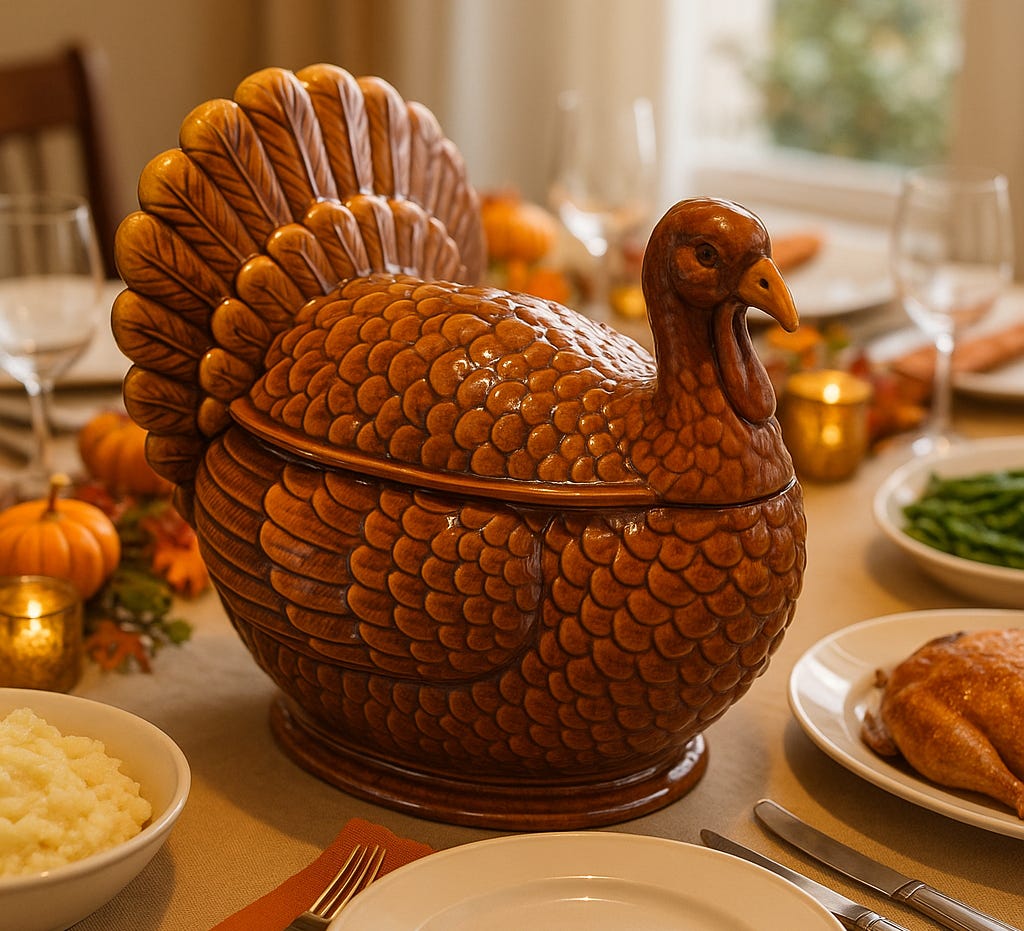 As we found our seats at the long pine dinner table later that afternoon, the fat, orange, and brown speckled turkey tureen sat in its place of honor in the middle of the table—like an old friend that kept coming back to visit, year after year.